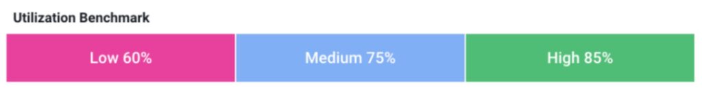 When we say utilization benchmark, we’re talking about that “sweet spot.” Every organization will be different – and every role will be different – but generally, you should aim to be as close to 100% without burning people out. This typically translates to a target benchmark of around 75–85%, leaving room for team members to complete admin work, jump in on new or quick-turn projects as they arise, or support company-specific initiatives while still allocating the majority of their time to billable projects.