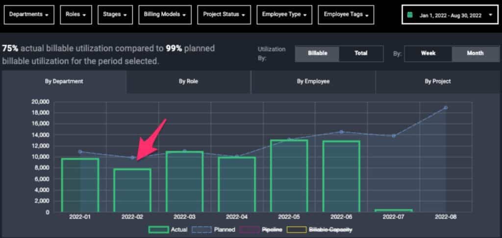 Alternatively, if there is no discrepancy between planned hours for the team and their total billable capacity, the issue likely might be that your delivery team is actualizing fewer hours than what was originally scoped and/or planned. Things like revenue leakage or even over-efficient delivery can cause utilization dips. This is what that looks like in Parallax: