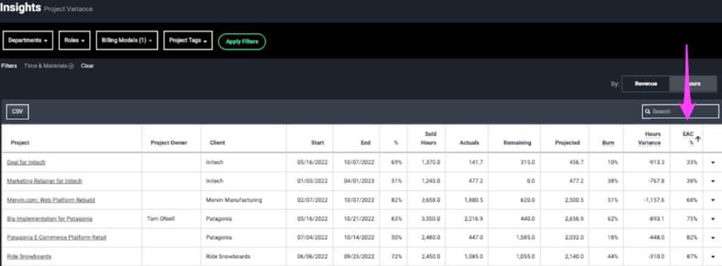 • Solution: Burn Against Budget Projections, often referred to as “Estimate at Complete” (EAC), should be used to understand where the team is expected to land in terms of burn against budget for a project. For T&M projects, a low EAC means that the team is forecasted to burn fewer hours than expected and miss the opportunity to bill for pre-budgeted hours.