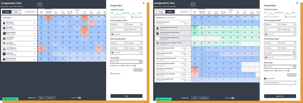 Assignments View Filtering: Within Assignments View, users can filter by employee type, department, project status, etc. They can filter these views through different deal stages in the pipeline, too, giving resource managers and delivery leads a great head start on planning for incoming work that’s likely to close. This future-forward view allows teams to plan ahead and better prepare both teams and resources, avoiding any last-minute scrambles.
